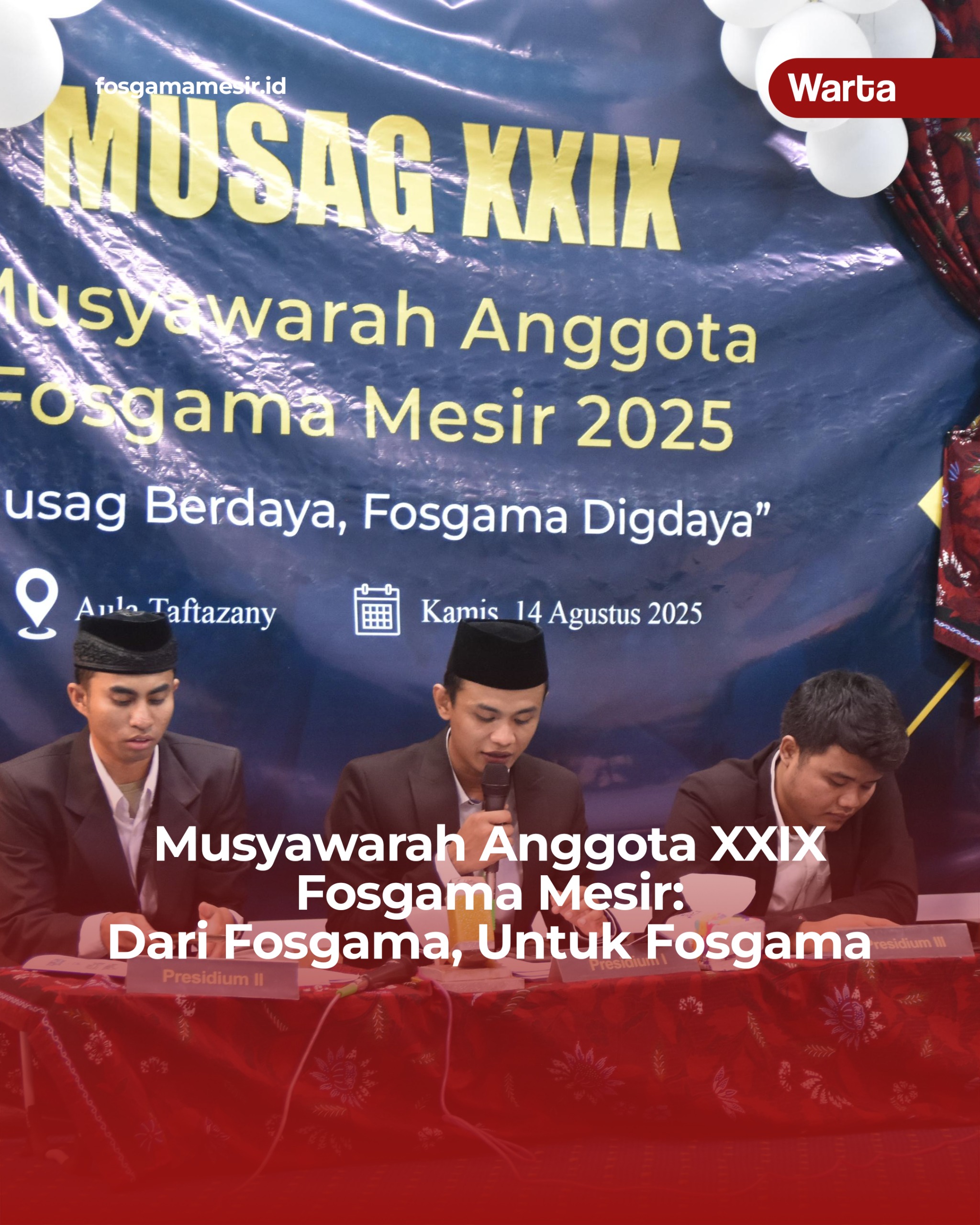 Fosgama Mesir – Kamis, 14 Agustus 2025 Panitia Musyawarah Anggota (Musag) ke-29 sukses menggelar pencoblosan gubernur baru Fosgama, Musyawarah Anggota dan Laporan Pertanggungjawaban Dewan Pengurus Fosgama periode 2024-2025. Musyawarah tahunan tersebut diselenggarakan di Taftazani Academy, Distrik 7, dan dihadiri oleh 180 warga Fosgama Mesir, meliputi Dewan Penasihat, Pimpinan Majelis Permusyawaratan Anggota (MPA), Tim Verifikasi, Kabinet Parjhugha (Dewan Pengurus Fosgama 2024-2025), calon gubernur dan segenap warga Fosgama. Acara tersebut resmi dimulai sejak pukul 13.00 dan berakhir pada 23.00 WLK.